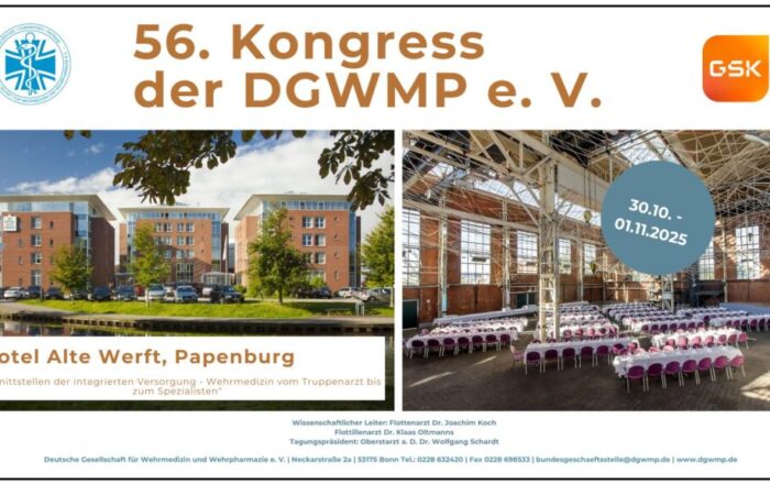 Datum: 30. Oktober bis 1. November 2025 Sprache: Deutsch Ort: Papenburg, Deutschland Die Deutsche Gesellschaft für Wehrmedizin und Wehrpharmazie (DGWMP) lädt vom 30. Oktober bis zum 1. November 2025 zum 56. Jahreskongress nach [...]